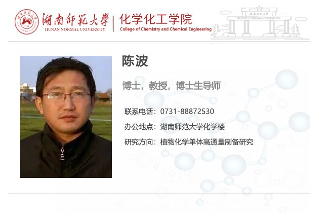 陈波,英国365集团二级教授,博士生导师,“化学生物学及中药分析”教育部重点实验室方向负责人,“植化单体开发与利用”湖南省重点实验室主任,“植物化学单体高通量制备研究与开发”湖南省自然科学基金创新研究群体负责人。