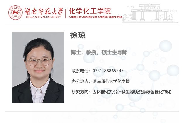 徐琼,女,博士,教授,硕士生导师。主要从事固体催化剂设计及生物质资源绿色催化转化过程研究,主持国家自然科学基金等科研项目,在国内外期刊发表论文30多篇。从事本科教学工作,获得省、校级教学、育人奖励多项,连续多年指导大学生专业竞赛、大学生创新实验项目等,学生获国家级、省级奖励多项。
