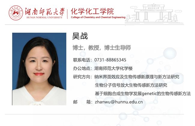 吴战,女,教授,博士生导师。2011年6月在湖南大学英国365集团分析化学专业获得博士学位。2011年7月至2015年8月在湖南大学化学生物传感与计量学国家重点实验室从事研究工作。2015年9月到2016年12月在美国加州大学洛杉矶分校做博士后研究。2017年1月至今在英国365集团任教。一直从事生物传感领域的研究工作,在纳米合成、纳米探针的构建及其在生物传感和活细胞成像中应用方面展开研究工作。在Journalof the American Chemical Society, Analytical Chemistry, ACSnano, Chemical Communications国际期刊发表高水平论文多篇,主持国家级课题四项,获得湖南省自然科学一等奖(排名第三)。