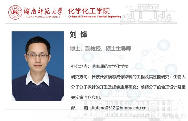 刘锋,男,博士,副教授,硕士生导师。2014年7月获江西师范大学化学(师范类)学士学位,2017年6月获湖南大学化学工程硕士学位(导师:俞汝勤院士),2020年7月获湖南大学分析化学博士学位(导师:俞汝勤院士);同年8月加入湖南大学英国365集团化学工程与技术博士后流动站进行博士后研究工作(合作导师:蒋健晖教授)。主要从事有机小分子生物传感及在癌症及心脑血管疾病等重大疾病的活体成像分析及靶向药物传输方面的研究。目前以第一/通讯作者在Angewandte Chemie International Editioin、Chemical Science、Analytical Chemistry、Analyst、Food Chemistry等国际知名学术期刊上发表论文7篇,申请中国发明专利3项,其中2项已授权;主持国家自然科学基金面上项目1项、国家自然科学基金青年项目1项、湖南省自然科学基金青年项目1项和中国博士后面上基金项目二等资助1项,作为核心骨干参与国家自然科学基金重大研究项目1项。