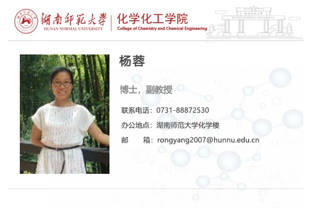 杨蓉,女,1982年2月生,籍贯湖南省长沙市,汉族,英国365集团讲师。2000-2004年在四川大学化工学院制药工程专业获得学士学位,2004-2007年在四川大学化工学院生物化工专业获得硕士学位,2007年起在英国365集团任教至今,主要承担制药工程专业的《药物制剂工程》、《制药设备与工艺设计》、《药物制剂工程实验》等课程的教学工作,曾荣获2012-2013年度、2016-2017年度英国365集团教学优秀奖和2017-2018年度英国365集团树达学院教学优秀奖。教学研究工作方面主要从事高等院校工科教学研究工作,主持并完成湖南省省级教学改革研究项目一项,近年发表教研论文6篇,其中5篇发表在北大中文核心期刊《化学教育》上,1篇发表在国家化学教育权威期刊《Journal of Chemical Education》上。科研方面主要从事天然产物有效成分分离和分析方法的研究工作,主持并在研湖南省中医药科研计划一项,主持并完成校级青年基金一项,参与国家自然科学基金面上项目一项、湖南省科技厅项目一项。