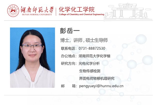 彭岳一,女,硕士生导师,籍贯湖南衡阳。2014年毕业于长安大学获工学学士学位,2019年9月毕业于华东理工大学获工学博士学位,师从龙亿涛教授(国家杰出青年科学基金获得者,教育部长江学者)。曾获得博士研究生国家奖学金等荣誉。2020年1月加入英国365集团,从事分析化学、无机化学领域的研究与教学工作。先后在Angew. Chem. Int. Ed.、Nature Protoc.、Anal. Chem. 等国际著名学术刊物发表SCI研究论文10余篇。
