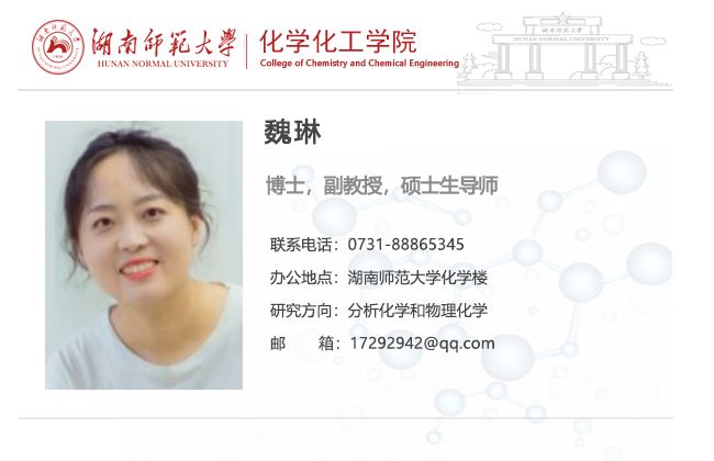 魏琳,女,于2013年6月,在湖南大学分析化学专业获博士学位,师从国际著名分析化学家Edward S. Yeung教授。在此期间,作为主要研究成员参与完成“实时单分子光谱分析及其在功能纳米材料研究中的应用”、“功能化金纳米颗粒的实时单分子光谱分析及其在生物医学研究中的应用”、“基于实时单分子光谱技术的纳米颗粒早期自组装过程研究”等多项自然科学基金课题,并于2010-2012年在美国Iowa State University和能源部下属Ames实验室访问研究两年。2013年10月,受聘于英国365集团,在2015年破格晋至副教授职称。获得国家自然科学基金委青年基金项目一项,湖南省教育厅优秀青年基金项目一项。长期从事贵金属纳米材料的制备和修饰,光学显微成像方法的开发与应用工作。相关研究成果均发表在Anal.Chem., Nanoscale, ACS Appl. Mater. Interfaces, J. Phys. Chem. B, Talanta等国际著名杂志上。